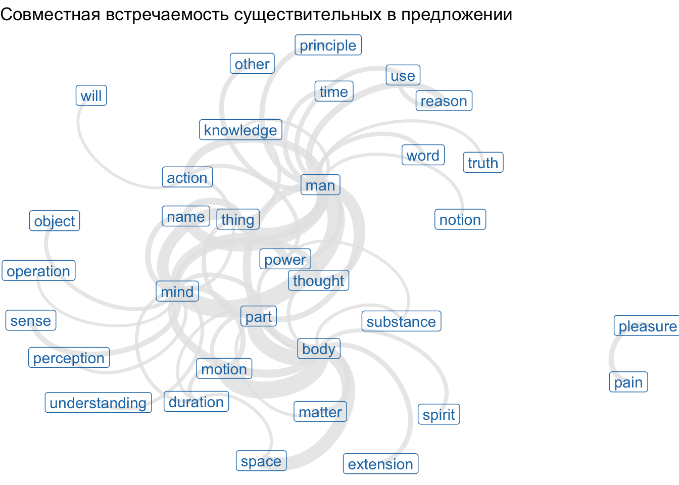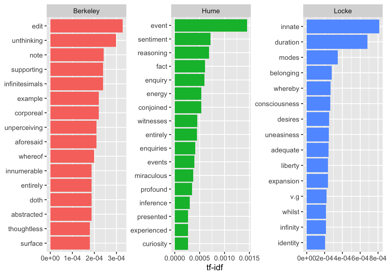 Логарифм единицы равен нулю, поэтому если слово встречается во всех документах, его tf-idf равно нулю. Чем выше tf-idf, тем более характерно некое слово для документа. При этом относительная частотность тоже учитывается! Например, Беркли один раз упоминает “сахарные бобы”, а Локк – “миндаль”, но из-за редкой частотности tf-idf для подобных слов будет низкой.
