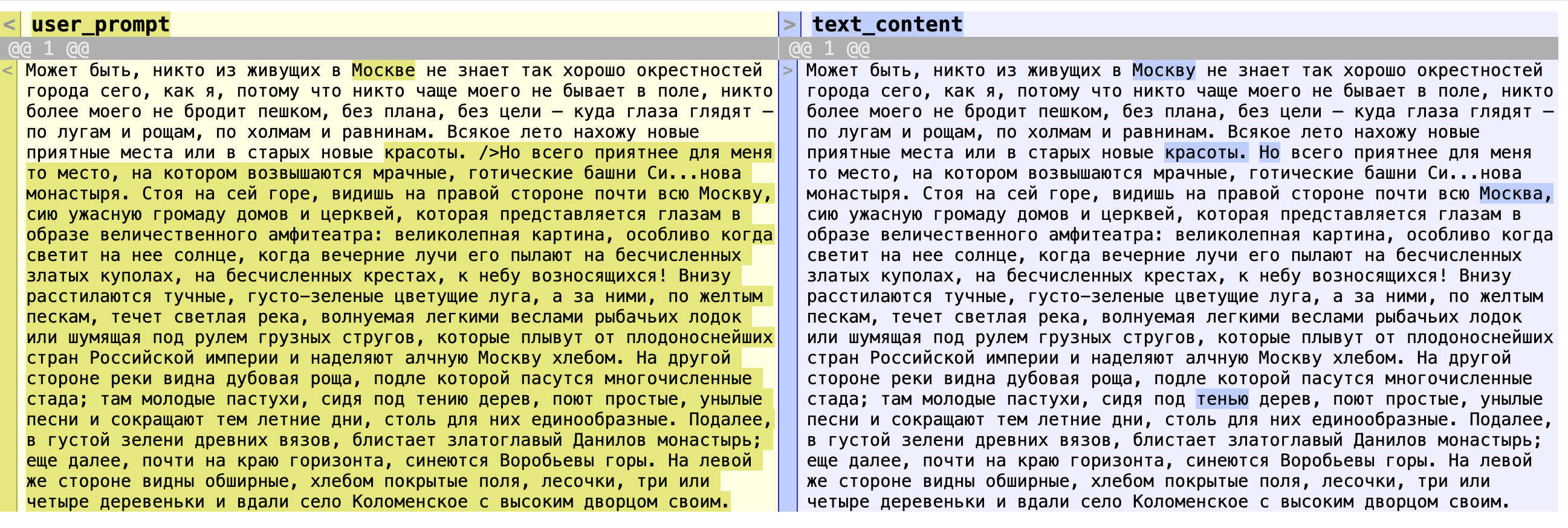 user_prompt <-"Может быть, никто из живущих в Москве не знает так хорошо окрестностей города сего, как я, потому что никто чаще моего не бывает в поле, никто более моего не бродит пешком, без плана, без цели — куда глаза глядят — по лугам и рощам, по холмам и равнинам. Всякое лето нахожу новые приятные места или в старых новые красоты.Но всего приятнее для меня то место, на котором возвышаются мрачные, готические башни Си...нова монастыря. Стоя на сей горе, видишь на правой стороне почти всю Москву, сию ужасную громаду домов и церквей, которая представляется глазам в образе величественного амфитеатра: великолепная картина, особливо когда светит на нее солнце, когда вечерние лучи его пылают на бесчисленных златых куполах, на бесчисленных крестах, к небу возносящихся! Внизу расстилаются тучные, густо-зеленые цветущие луга, а за ними, по желтым пескам, течет светлая река, волнуемая легкими веслами рыбачьих лодок или шумящая под рулем грузных стругов, которые плывут от плодоноснейших стран Российской империи и наделяют алчную Москву хлебом. На другой стороне реки видна дубовая роща, подле которой пасутся многочисленные стада; там молодые пастухи, сидя под тению дерев, поют простые, унылые песни и сокращают тем летние дни, столь для них единообразные. Подалее, в густой зелени древних вязов, блистает златоглавый Данилов монастырь; еще далее, почти на краю горизонта, синеются Воробьевы горы. На левой же стороне видны обширные, хлебом покрытые поля, лесочки, три или четыре деревеньки и вдали село Коломенское с высоким дворцом своим."