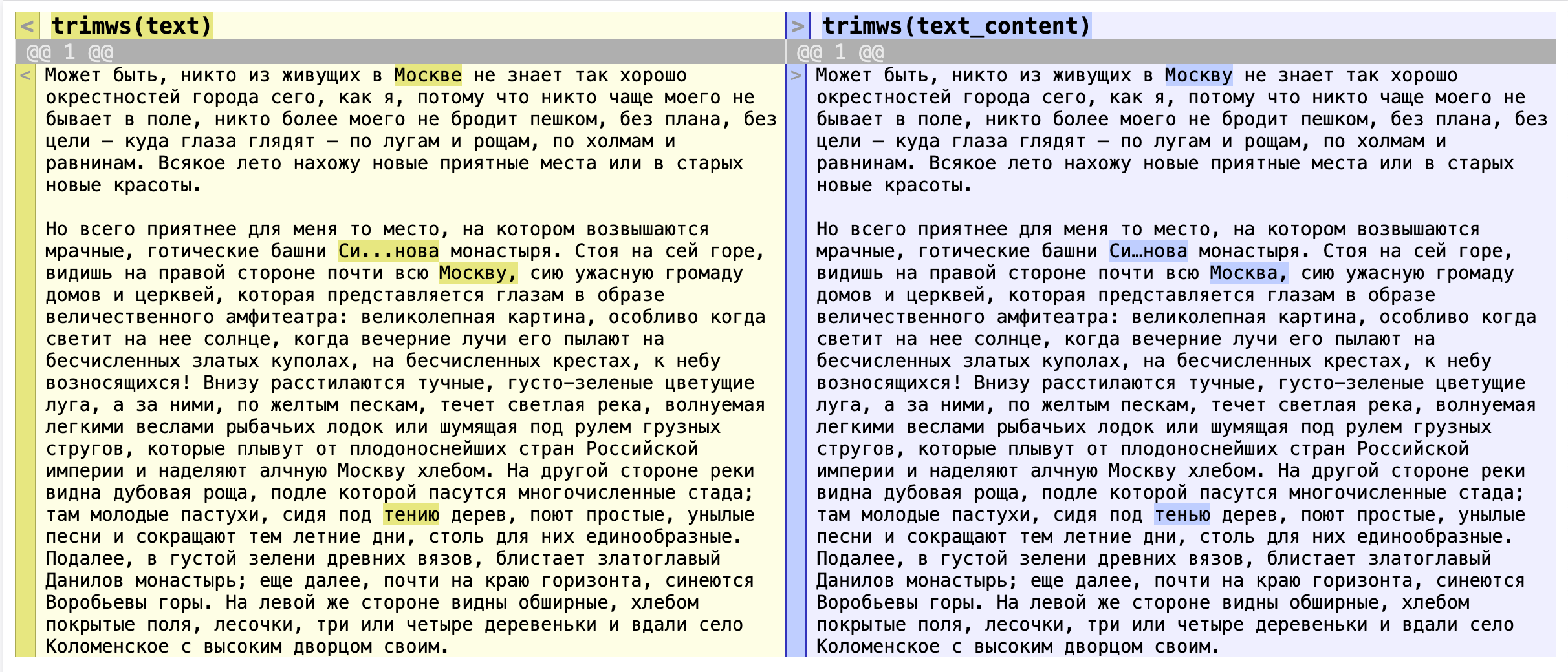 diffChr(trimws(text), trimws(text_content), mode = "sidebyside")