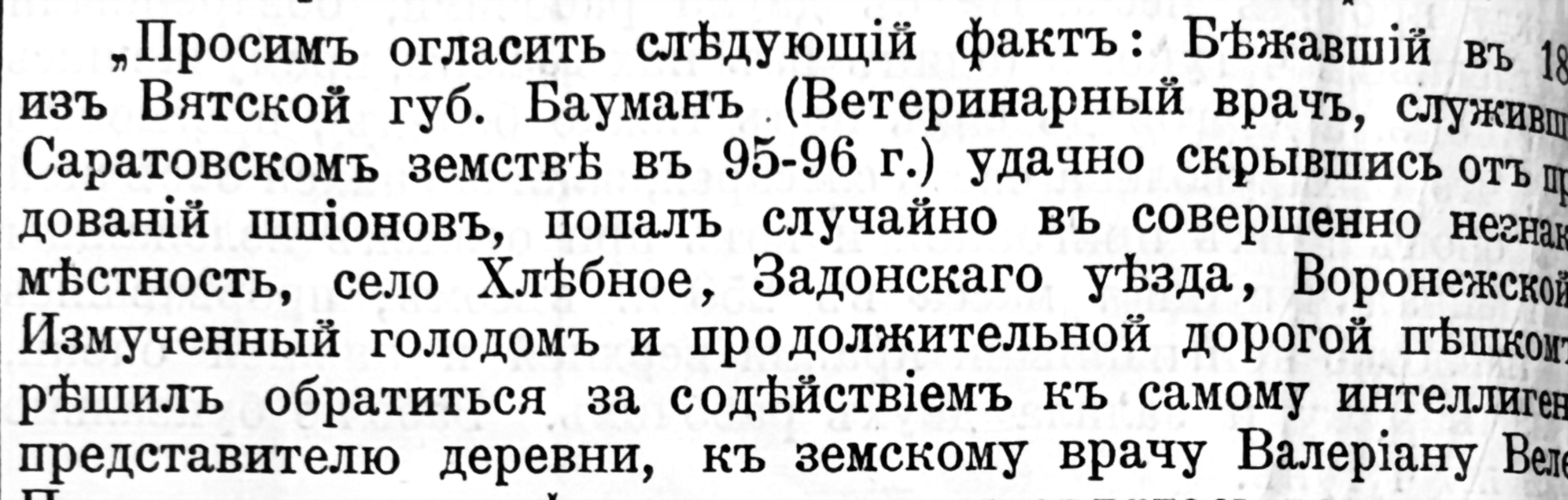 res <- chat$chat(content_image_file("processed.png"),"Распознай текст на изображении. ")# Текст на изображении:# # > # > Просим огласить следующий факт: Бывшавший в 1894 г. из Вятской губ. # Бауман (ветеринарный врач, служивший в Саратовском земстве в 95–96 гг.)# удачно скрылся от преследований шпионов, попав случайно в совершенно # незнакомую местность, село Хлебное, Задонского уезда, Воронежской # губернии. Измученный голодом и продолжительной дорогой пьяный, он # резонно решил обратиться за содействием к самому интеллигентному # представителю деревни, к земскому врачу Валериану Валерьевичу.# > # >