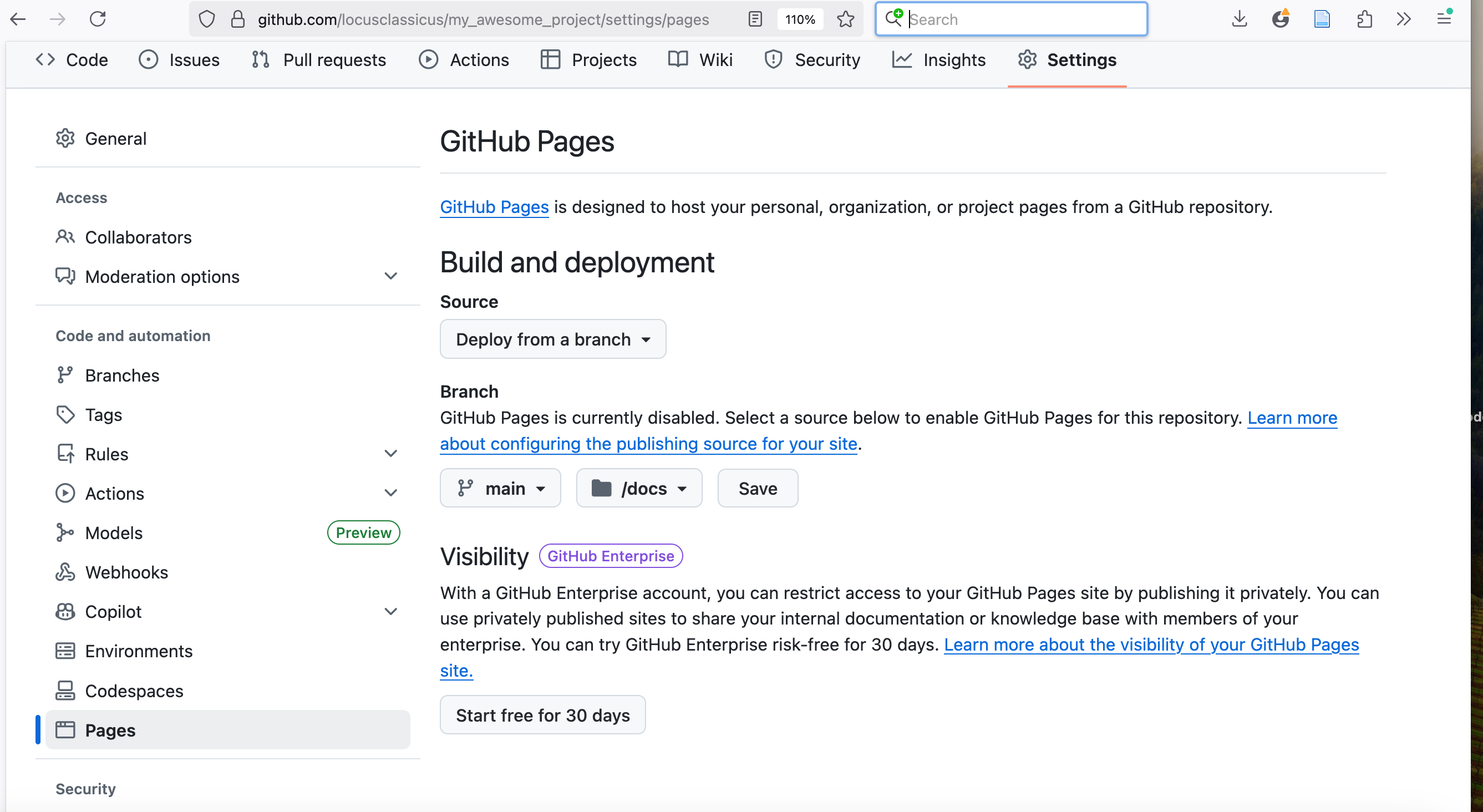 Для начала можете закоммитить сайт. После этого идем на GitHub, обновляем страницу репозитория, а затем и включаем Pages, указав, что наш сайт будет рендериться из папки docs.