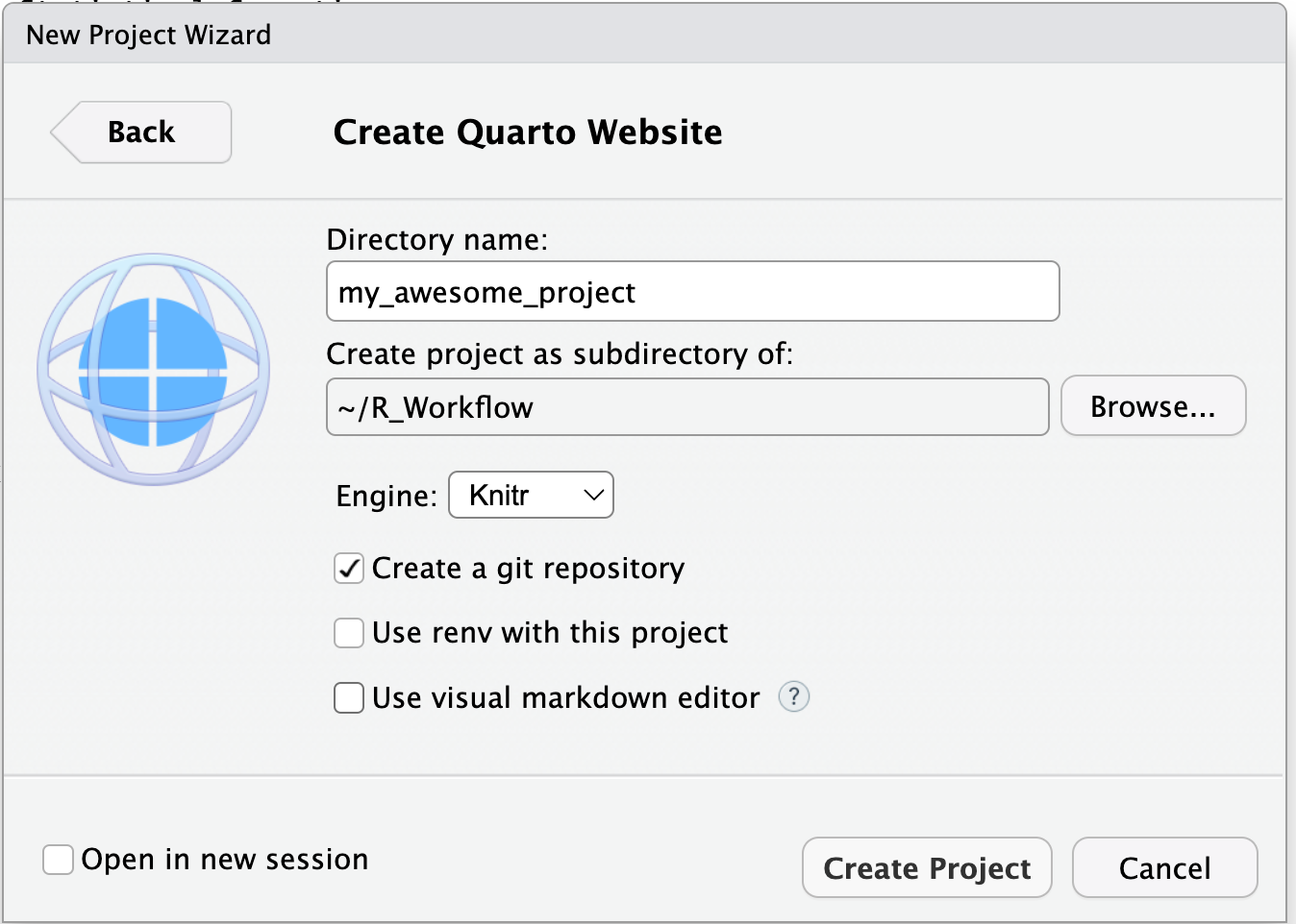 Создайте проект Quarto под контролем версий. В меню идем File -> New Project -> New Directory -> Quarto Website. Поставьте галочку, чтобы проект был под контролем версий.
