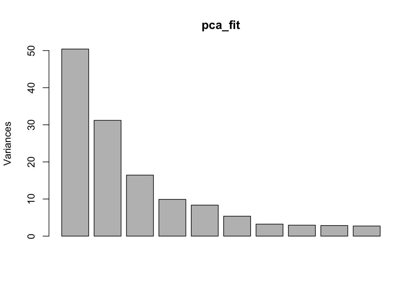 round(pca_fit$sdev, 3) [1] 7.100 5.586 4.055 3.147 2.891 2.318 1.799 1.720 1.691 1.653 1.385 1.345