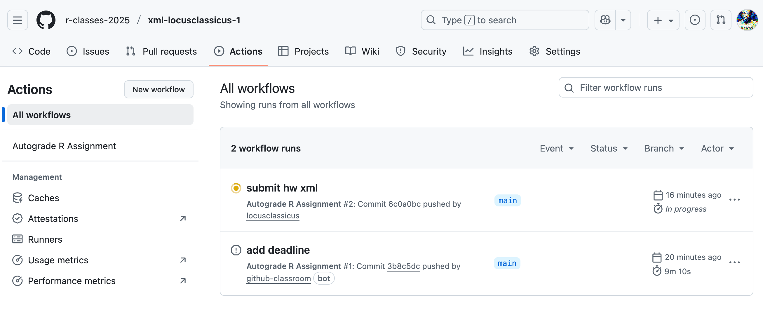 Вот так выглядит вкладка Actions. Желтый цвет означает, что workflow в работе.