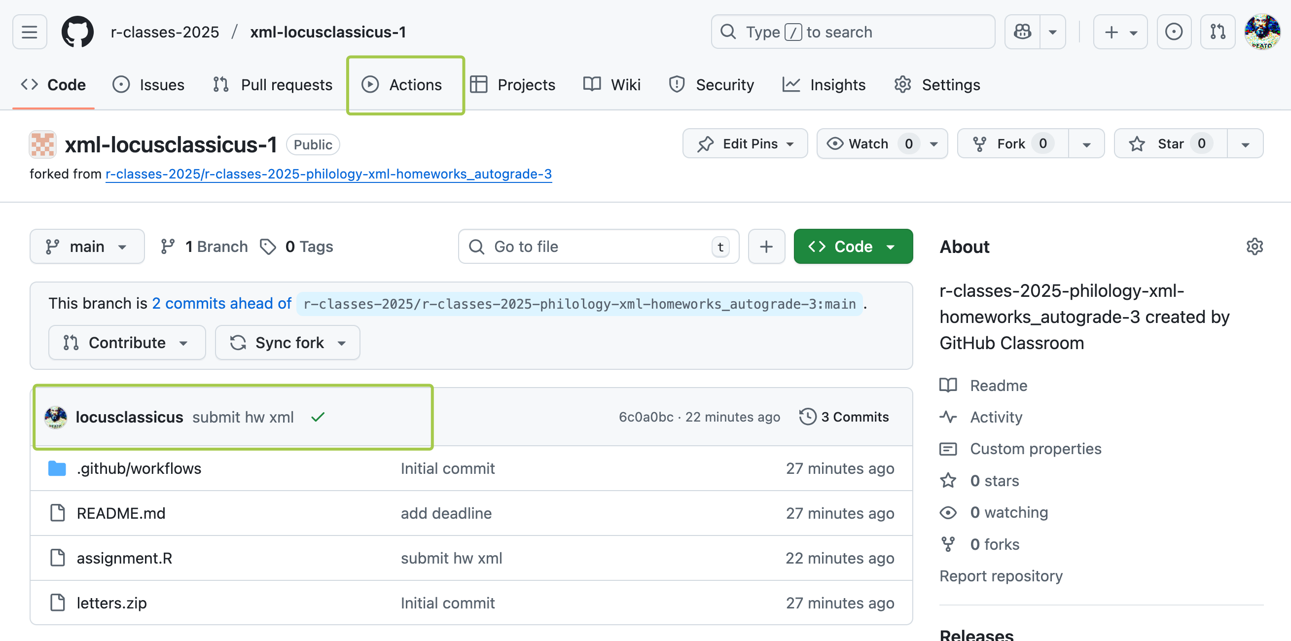 - Вы можете пройти на вкладку Actions (см. фото выше), найти там свой коммит (вы же его как-то назвали, помните?) и посмотреть ошибку. После исправления ошибки сделайте новый коммит.