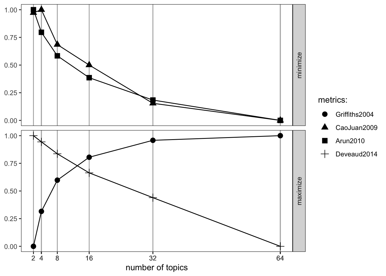 plan(multisession, workers =6)n_topics <-c(2, 4, 8, 16, 32, 64)news_lda_models <- n_topics |>future_map(topicmodels::LDA, x = news_dtm, control =list(seed =0211), .progress =TRUE)