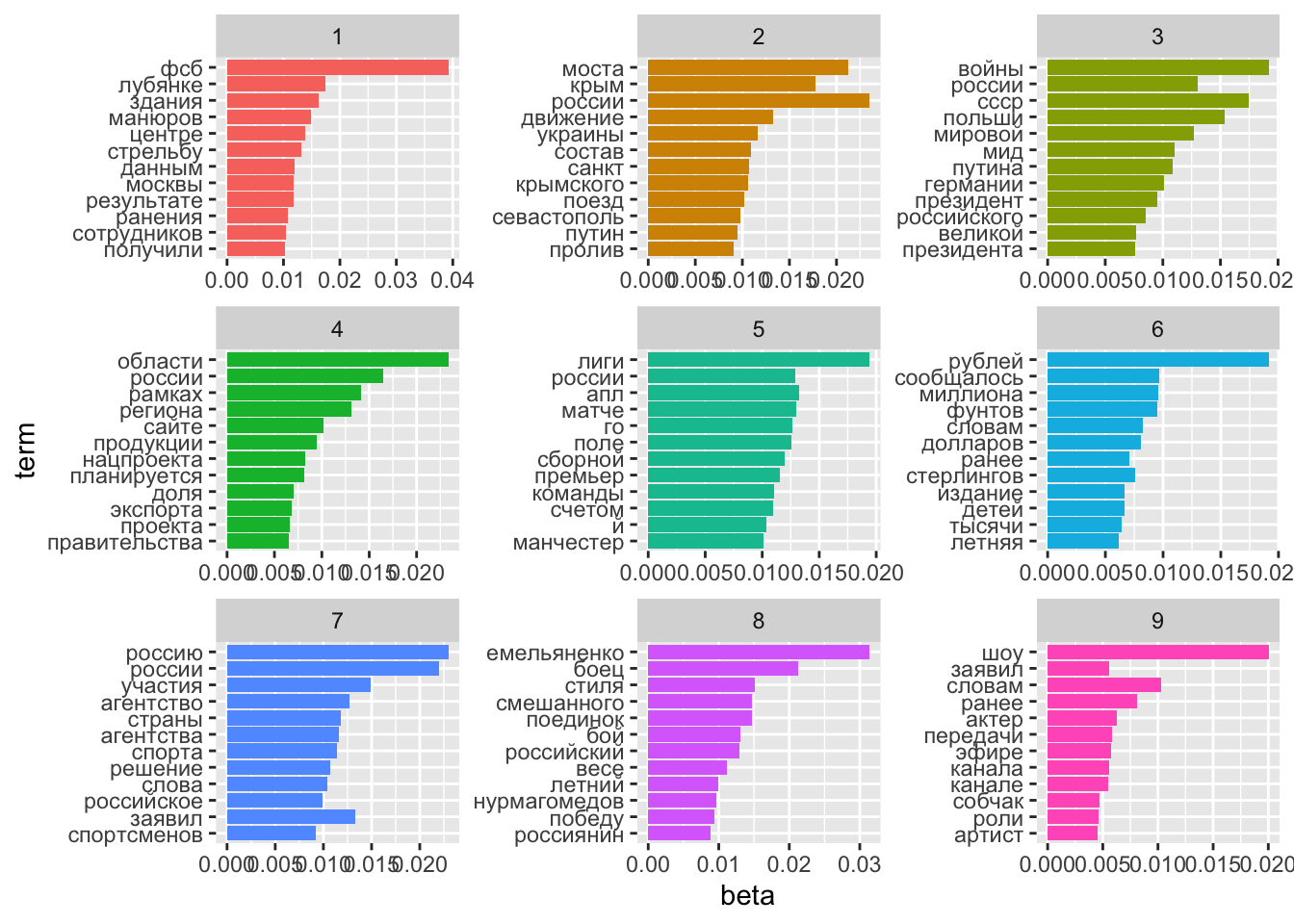 Теперь наша тематическая модель готова. Ее можно скачать в формате .Rdata отсюда; это примерно 2.5 Mb.