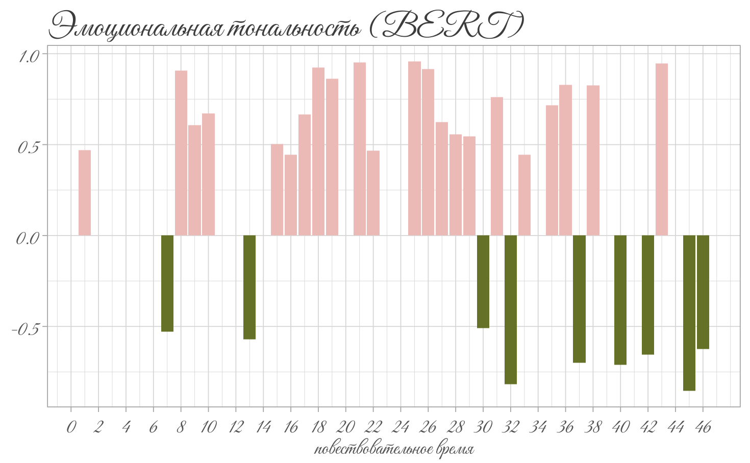 Таблица, которую мы подготовили, позволяет наглядно показать, как меняется тональность во времени – разумеется, речь идет о повествовательном времени, которое измеряется не в минутах, а в словах.
