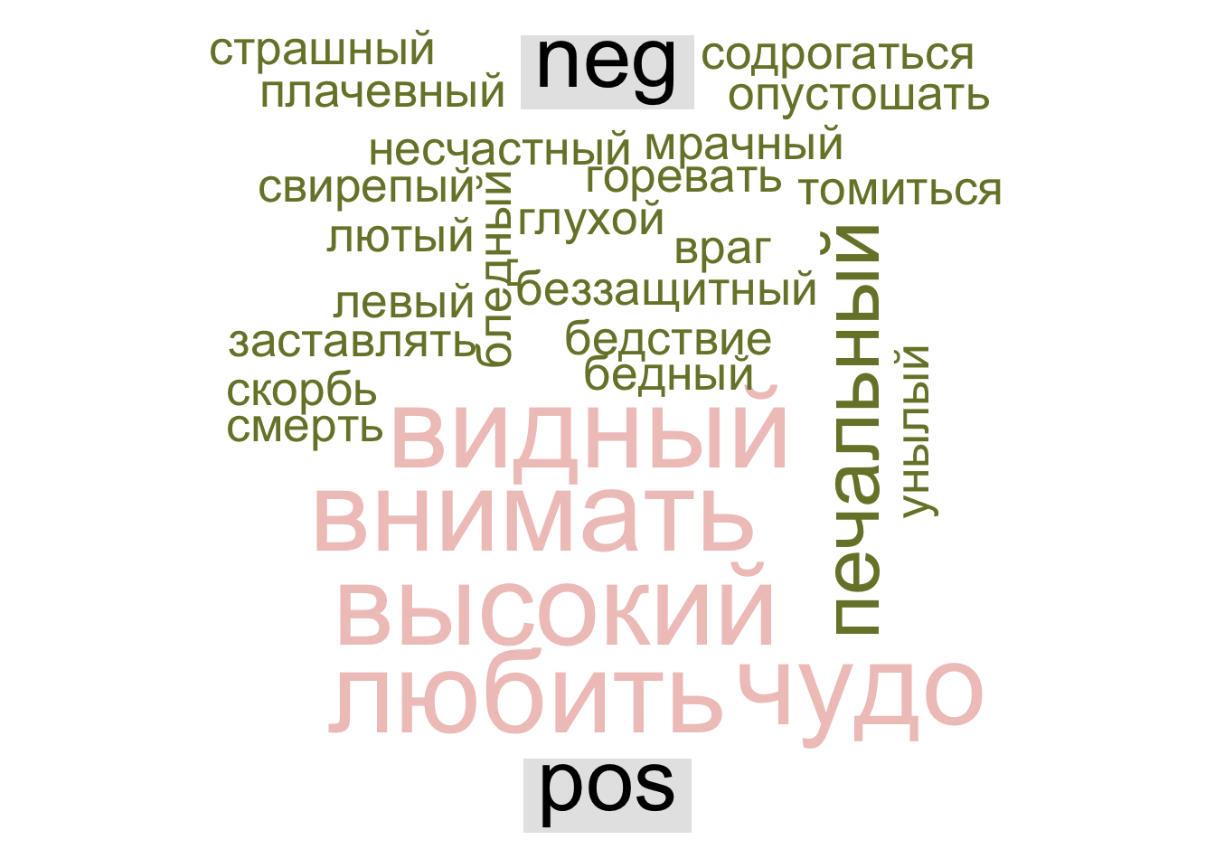 Современные лексиконы могут не очень подходят для анализа классической литературы. Например, в лексиконе AFINN, доступном в пакете rulexicon, слово “старый” имеет отрицательную оценку, как и слово “чувствительный”.