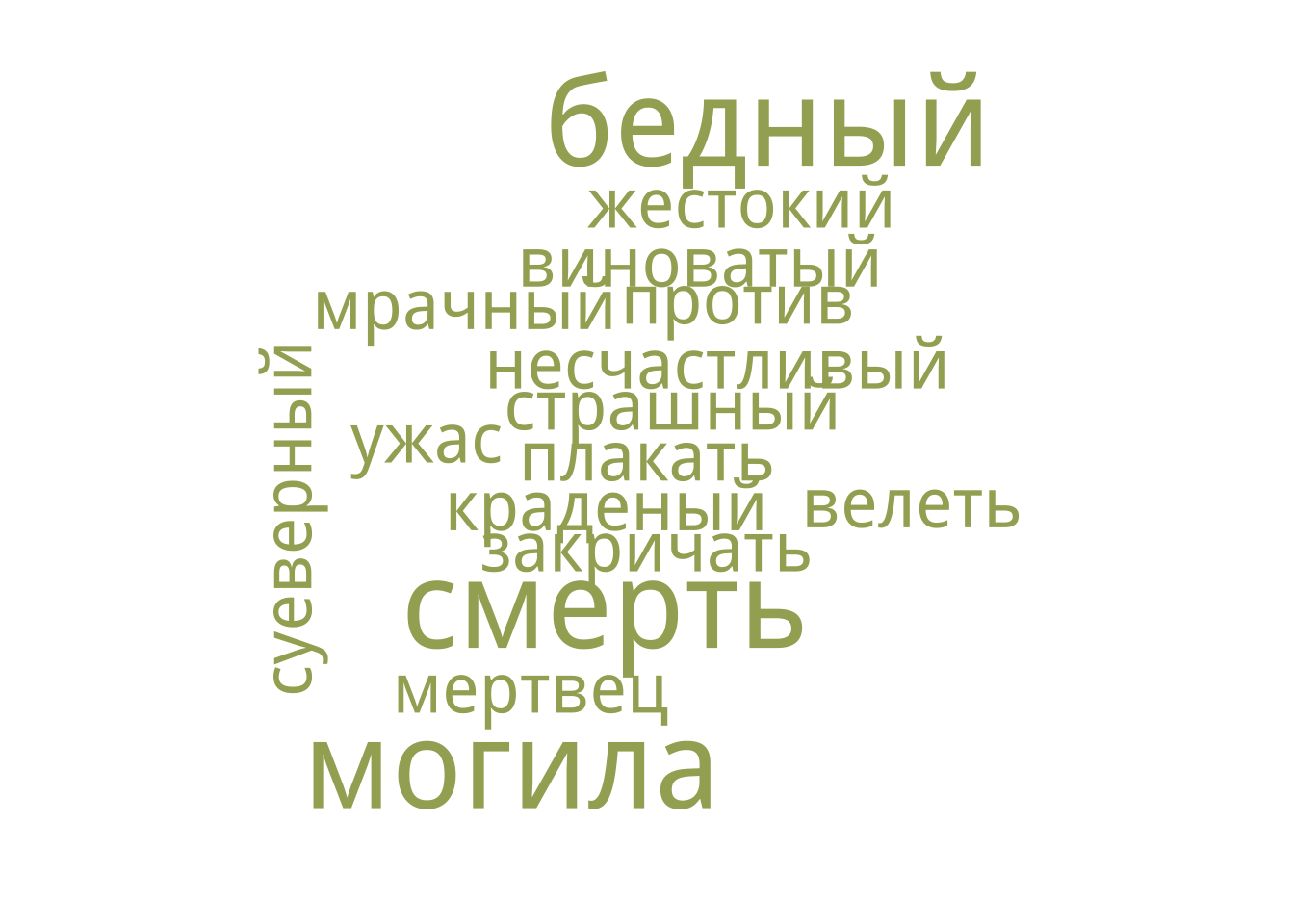 Здесь видно, что негативная тональность в этой части не связана с судьбой героев: об этом говорят такие слова, как “лютый”, “враг”, “свирепый”. Рассказчик, глядя на заброшенный Симонов монастырь, вспоминает о “печальной истории” Москвы. Если верить нашей модели, самый мрачный фрагмент повести посвящен не судьбе бедной девушки, а “глухому стону времен”: