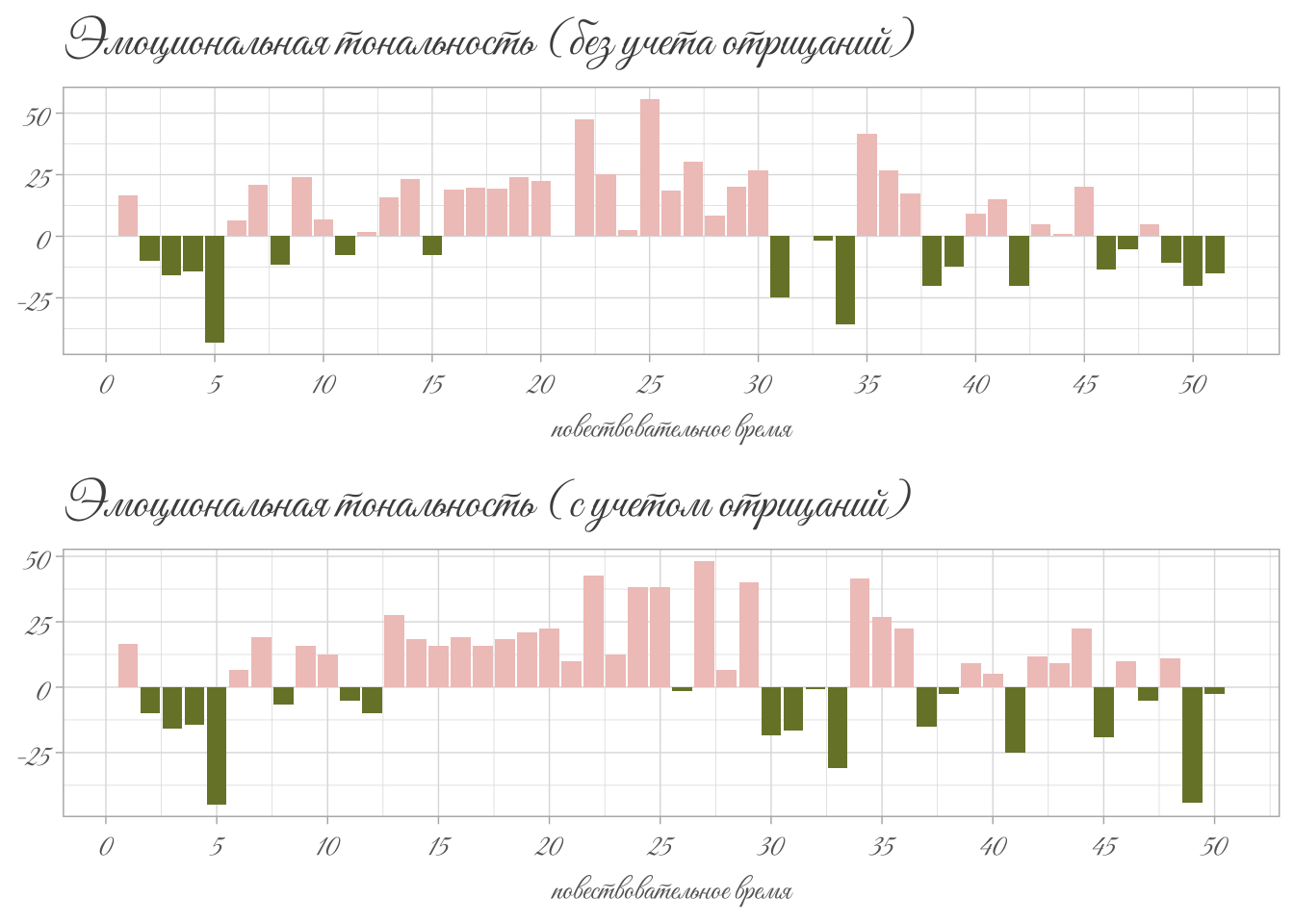 Помимо этого, повысилось абсолютное значение негативной тональности в последних отрывках, хотя на это повлияли не столько отрицания, сколько изменение числа слов и перераспределение их по отрывкам.